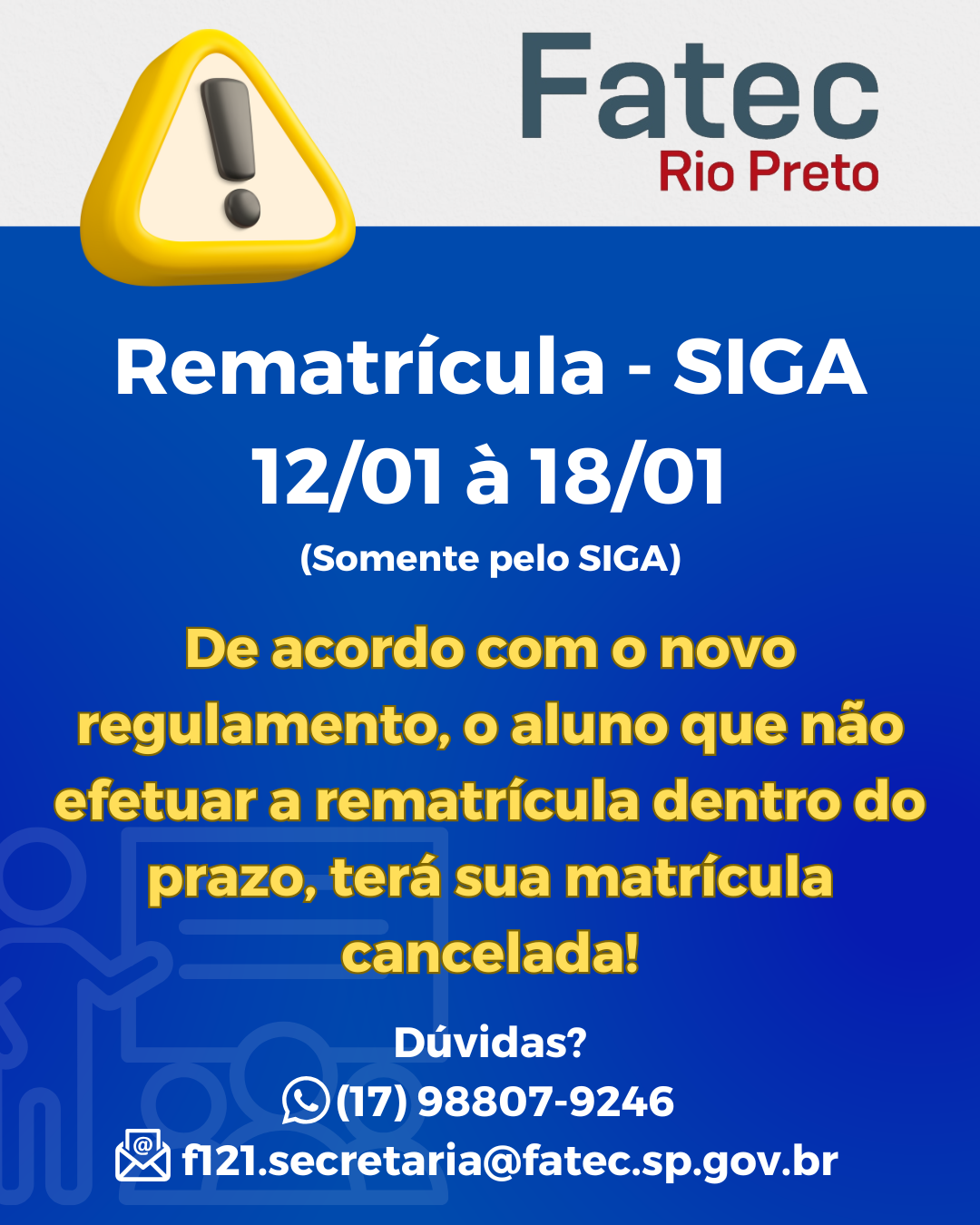 A rematrícula será de 12/01 à 18/01, somente pelo SIGA.