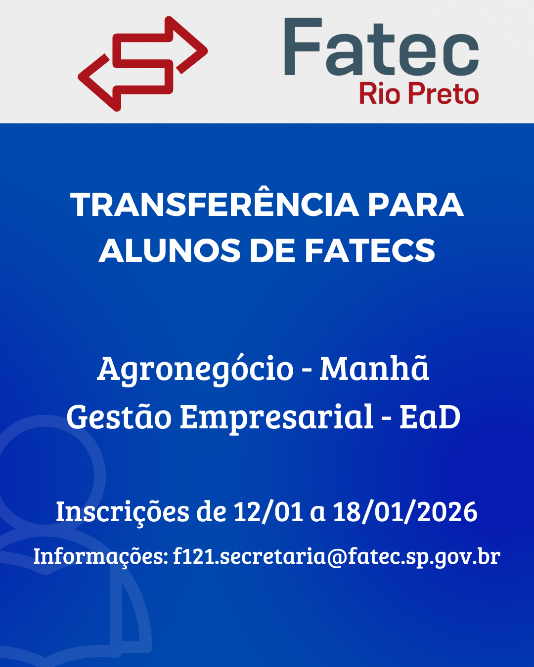 A Coordenadoria da Faculdade de Tecnologia de São José do Rio Preto, torna público o presente Edital para o preenchimento de vagas remanescentes dos cursos de Agronegócio (Turno da Manhã) e Gestão Empresarial (EaD).