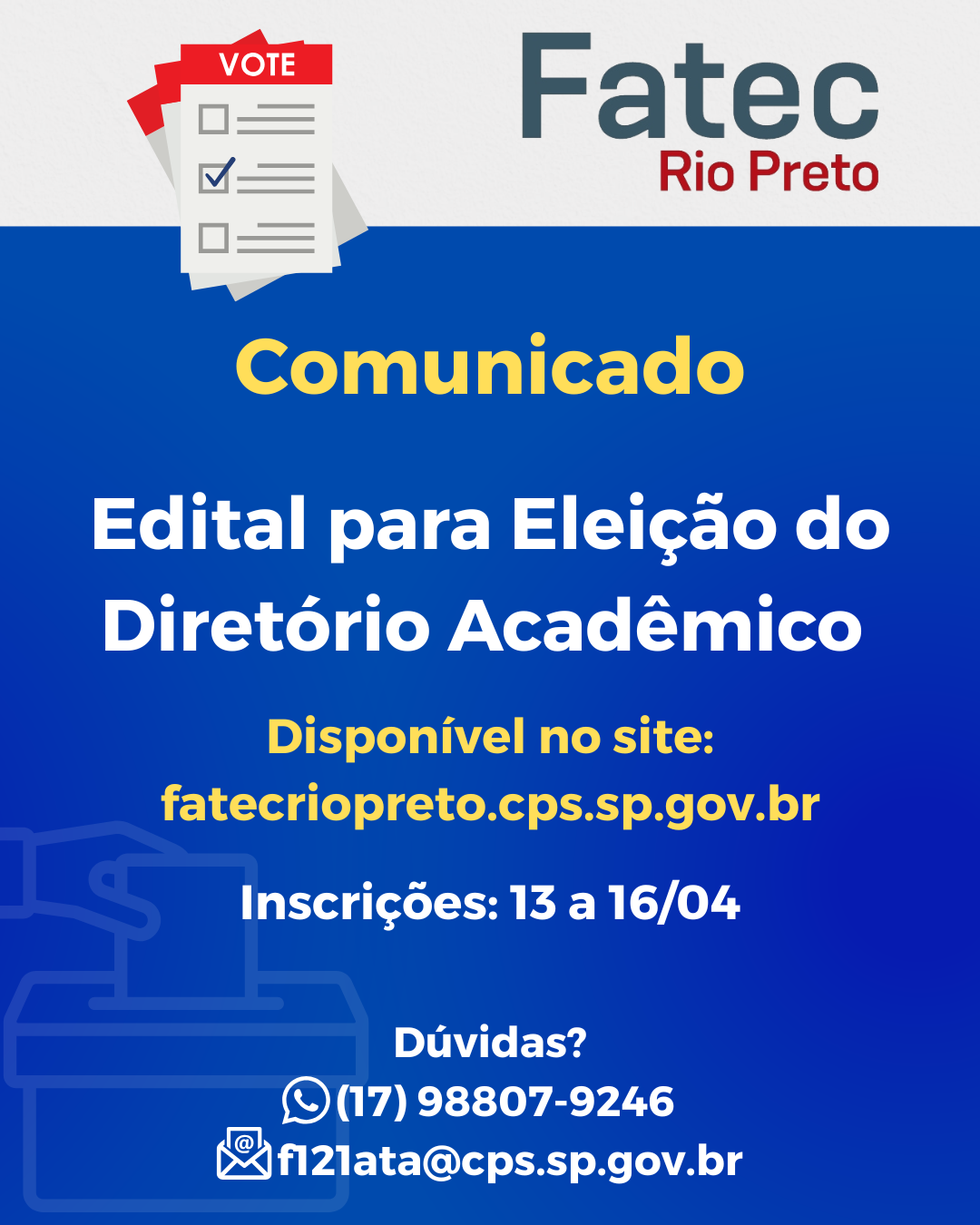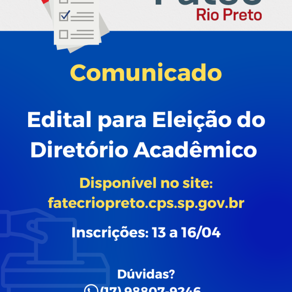 A Diretoria da Faculdade de Tecnologia de São José do Rio Preto – Fatec Rio Preto comunica aos seus discentes que, na forma do artigo 32, parágrafo 1º, do Estatuto Social do Diretório Acadêmico, entre os dias 13 e 16 de abril de 2026, estará aberto o prazo para inscrição de chapas completas para concorrerem à eleição da diretoria do Diretório Acadêmico da Fatec Rio Preto.