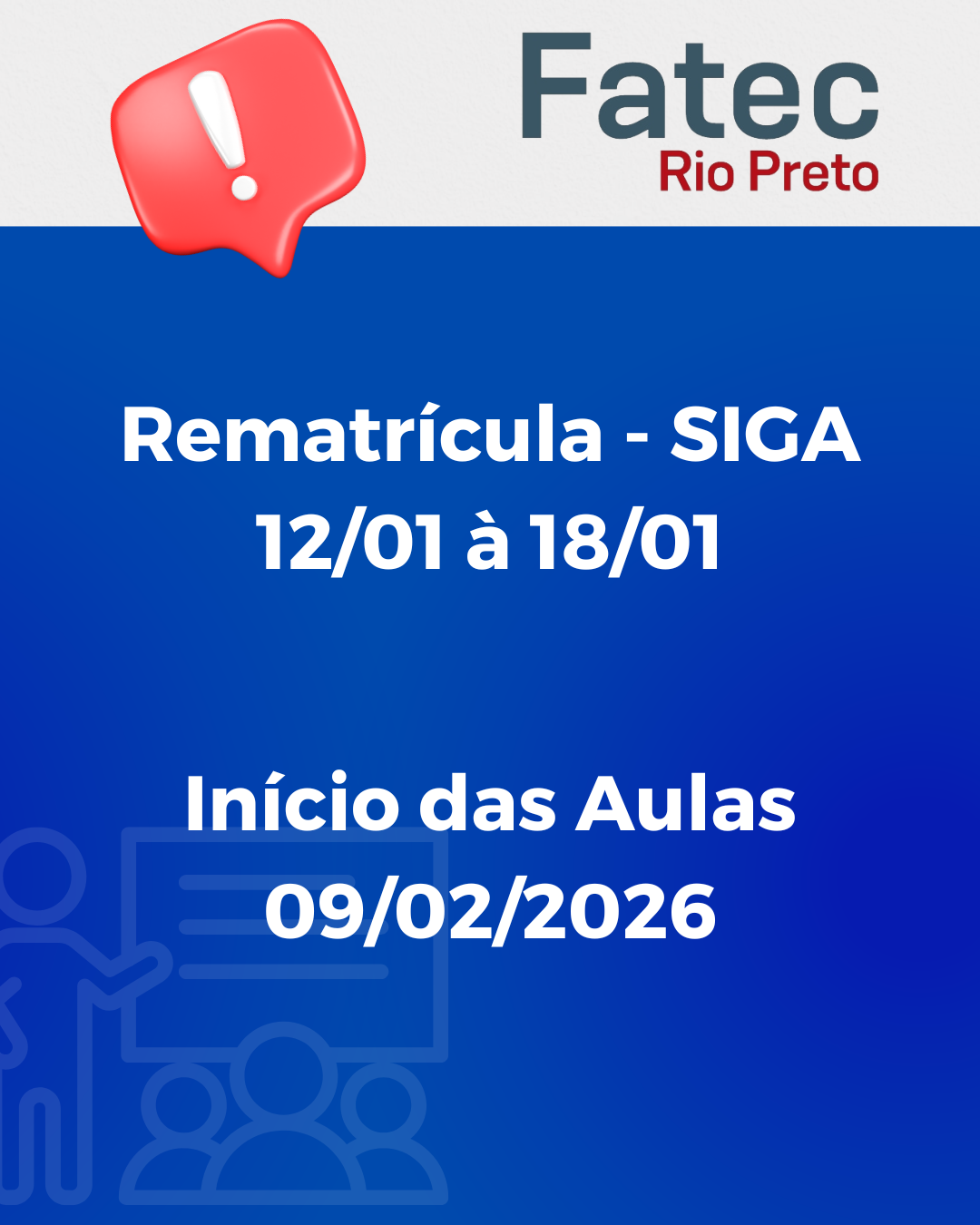 Atenção Alunos! A rematrícula será de 12/01 à 18/01, somente pelo SIGA. https://siga.cps.sp.gov.br/sigaaluno/applogin.aspx Não haverá atendimento presencial, somente por e-mail, telefone ou WhatsApp. f121.secretaria@fatec.sp.gov.br (17) 3217-8004 – Fixo (17) 98807-9246 – WhatsApp Início das aulas […]